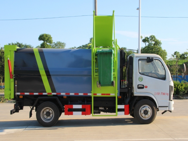 2、提升機構(gòu)將垃圾標(biāo)準(zhǔn)桶提升**車頂以后,再通過翻料機構(gòu)將桶內(nèi)的餐廚垃圾倒入車廂內(nèi)。標(biāo)準(zhǔn)桶再通過提升裝置送回地面;